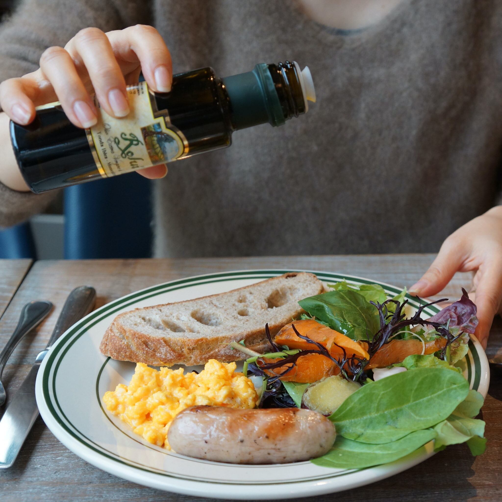 炭火で焼いたグリル野菜にひと振り、サンドウィッチに使用する自家製マヨネーズへもこのオリーブオイルを使っています。