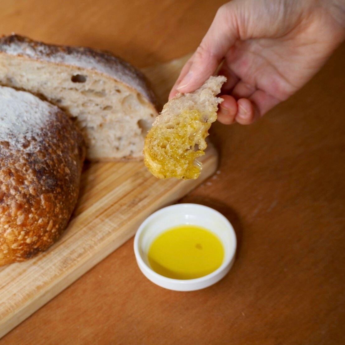 たっぷりのオリーブーオイルと塩をサワードウブレッドにつけて食べると、