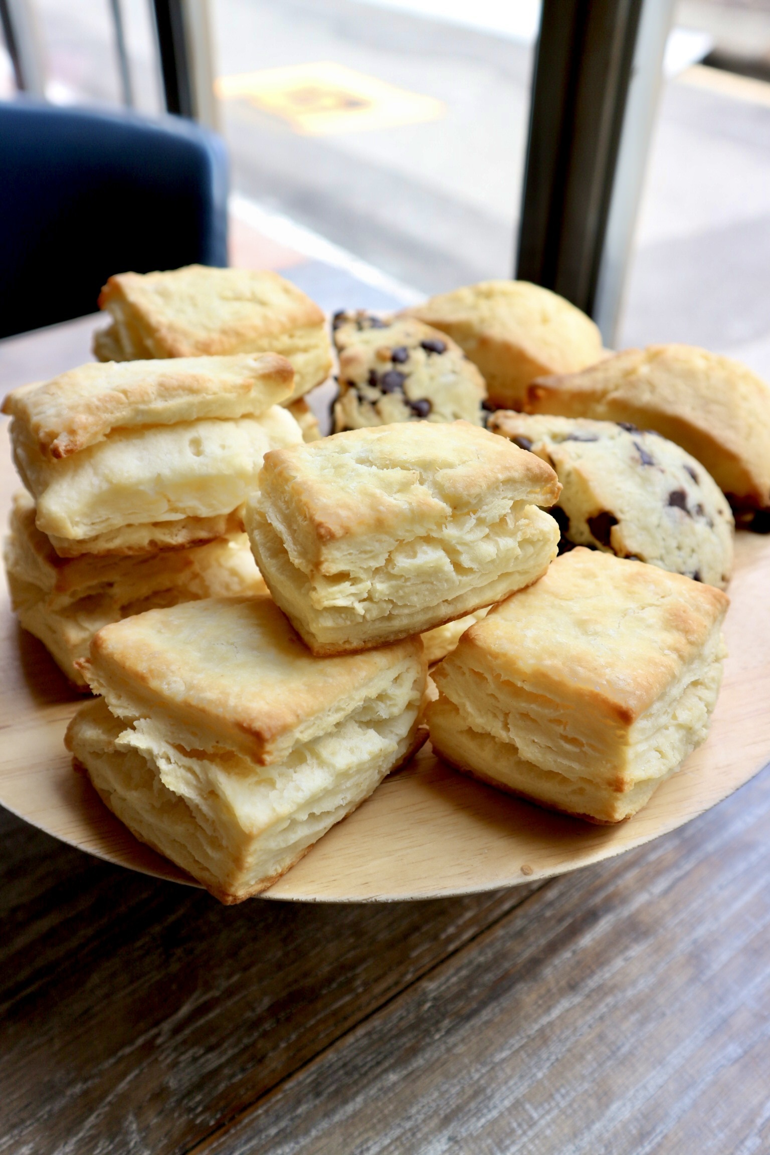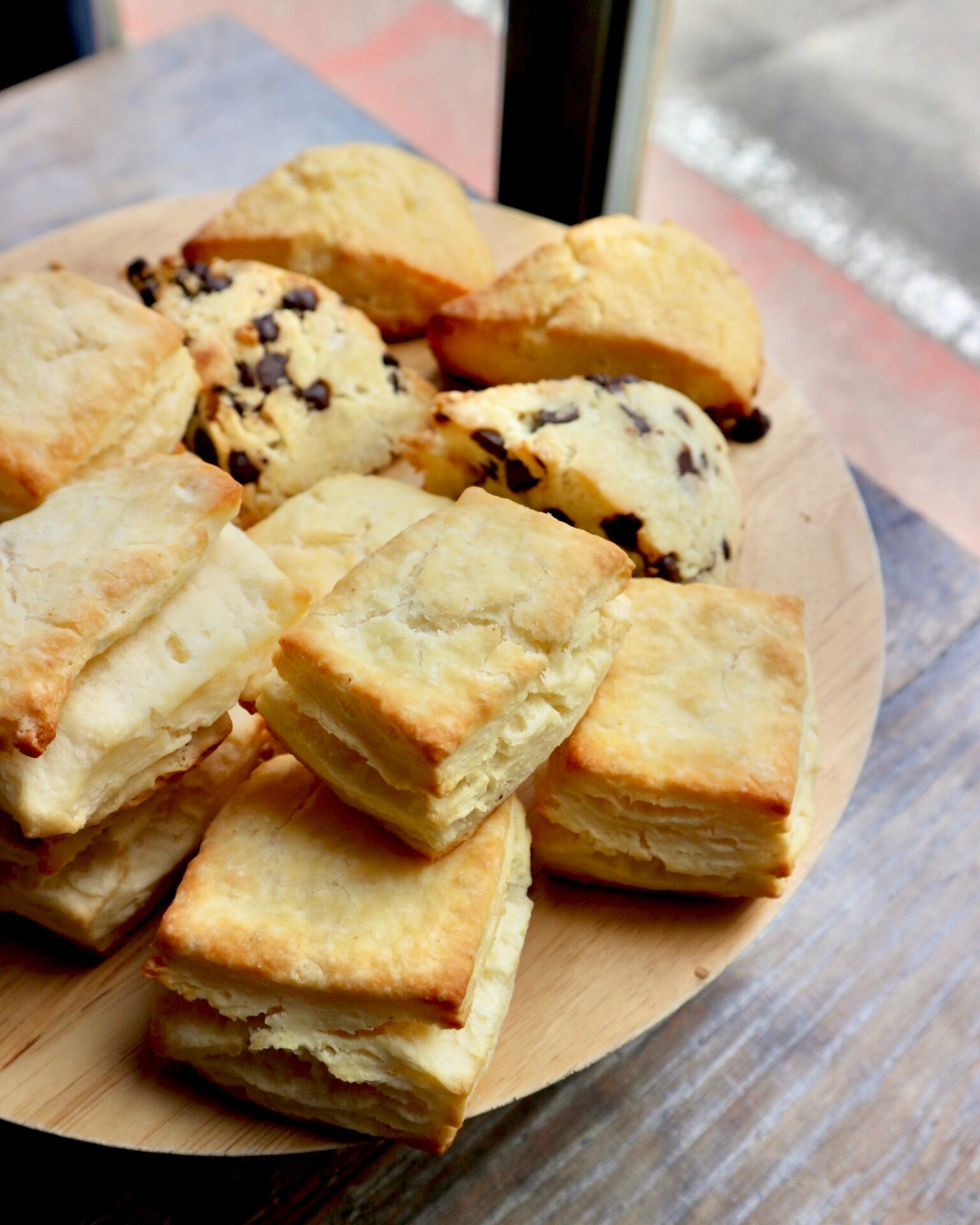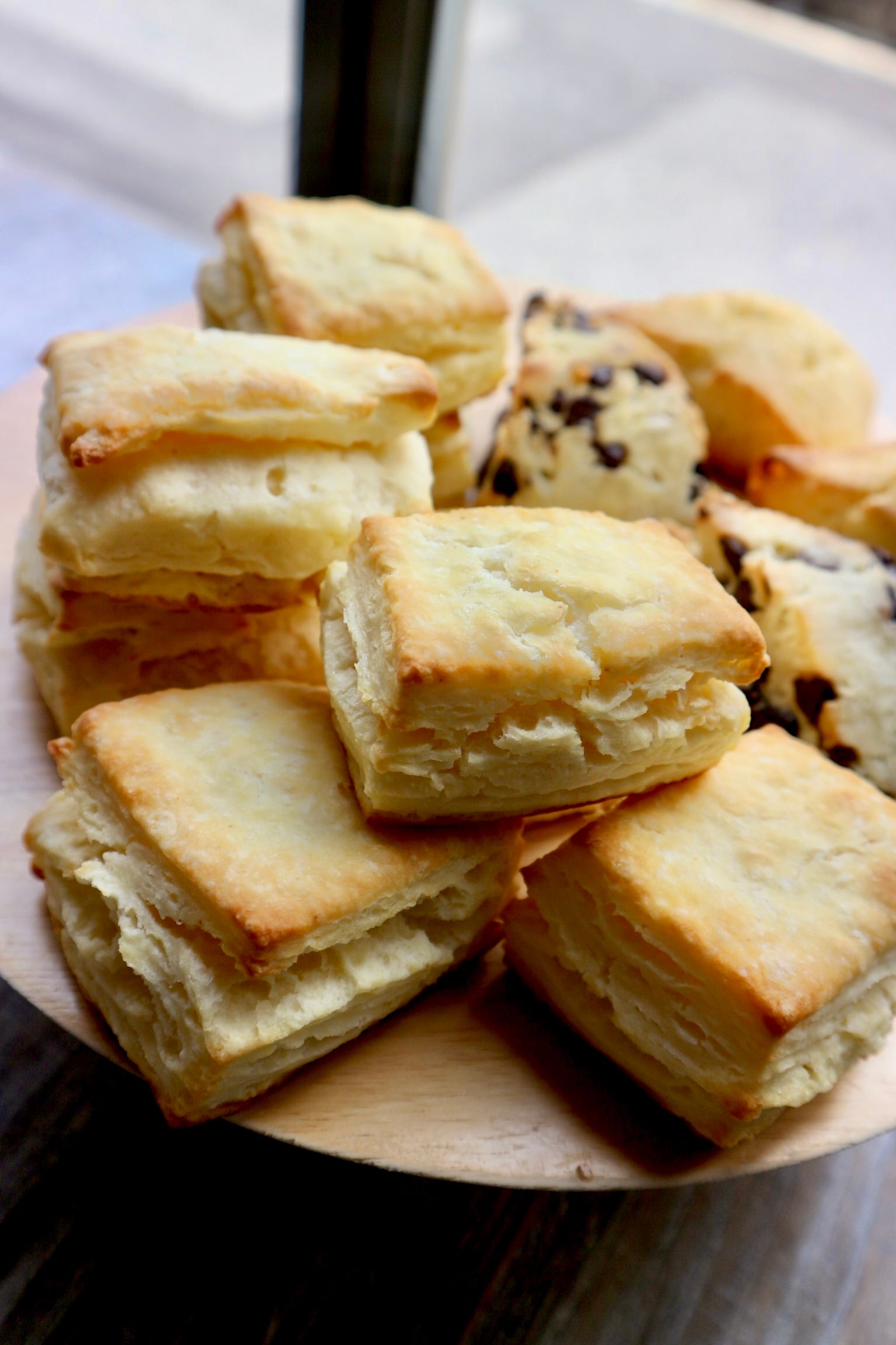 何度も生地を折りたたんで層になっているビスケットは甘さは控えめ、